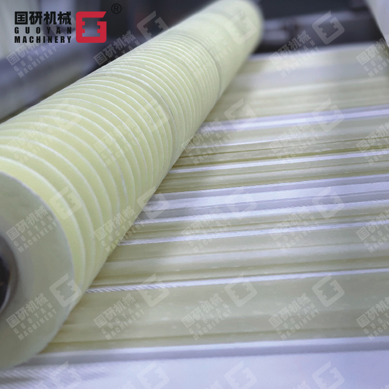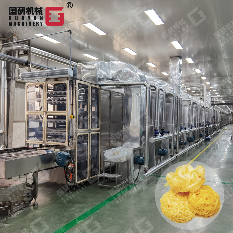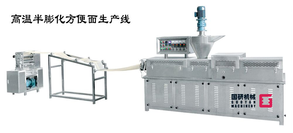 高温半膨化非油炸方便面生产线,是集自动和面、自动加料、挤压膨化、面片冷却输送、自动切条、分行输送自动提升、加湿回软切断、自动落盒成形、自动干燥到成品输送入包装于一体的全自动生产线。该设备主要应用于挤出式非油炸快食面的生产,工艺流畅、功能齐全、自动化程度高,机器出品稳定,工艺技术强于国内同类生产设备,是油炸方便面厂家更新换代的理想选择。